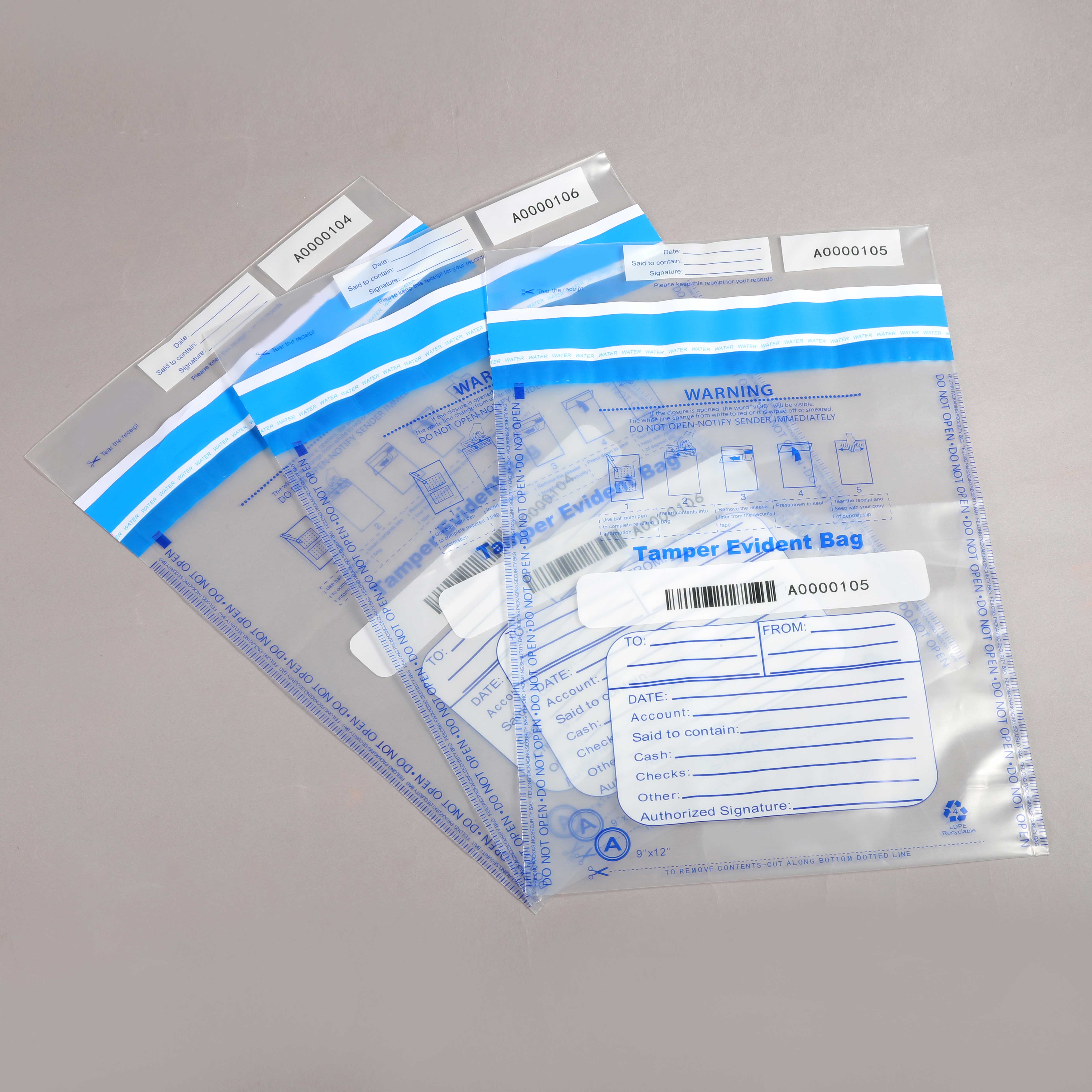| Each bag is with a unique serial number and barcode to ensure safety. |